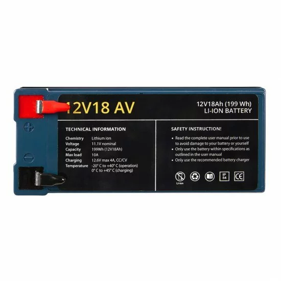 Potente y liviana batería de iones de litio 12V18 para pesca con caña para usar con botes de cebo, sondas y fuentes de alimentación a lo largo de la costa. Tiene las mismas dimensiones que una batería de plomo-ácido 12V9A y un tiempo de funcionamiento hasta 3 veces mayor.