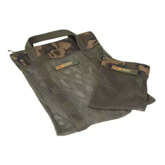 Bolsa Air Dry Camolite Grande. Se suministra con bolsa de anzuelo gratis Perfecto para secar los boilies durante sesiones más largas Asas de transporte reforzadas Estampado exclusivo de Fox Camo Cremalleras resistentes 100% poliéster tratado de 500 Denier 48 x 51 cm.
