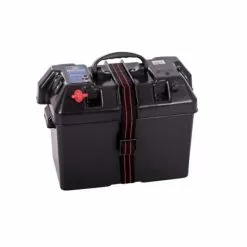Práctica caja de batería con tapa con cableado premontado para conexión de terminal de batería, enchufe de 2x12V, conexión de tuerca de mariposa externa para conectar, por ejemplo, un motor eléctrico o un cargador de batería. La caja de batería también está equipada con un práctico probador de batería; con solo presionar un botón se le informa del estado de la batería. Por lo tanto, esta caja de batería es la solución ideal para barcos pequeños sin una red fija a bordo y situaciones en las que no se dispone de una red directa de 12 V, como cuando se utiliza un motor eléctrico. Para su protección, la caja de batería está equipada con 2 fusibles de vidrio (para el art. n.º 14.641.105) o 2 disyuntores (art. n.º 14.641.106). Las tomas de 12V tienen un fusible de 15A y la conexión del motor eléctrico tiene un resp. de 30A. fusible de 50A.