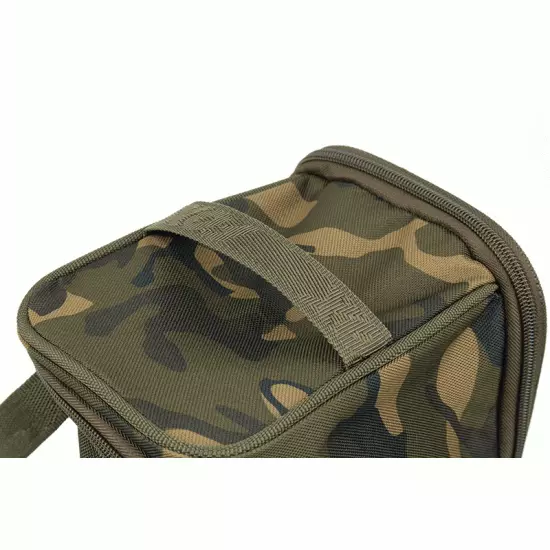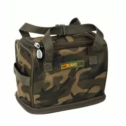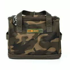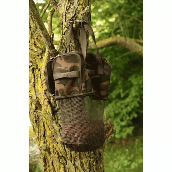 Bolsa de cebo de doble función Sistema desplegable integrado para liberar la malla Se adapta perfectamente a los bolsillos de malla de todas las carretillas Explorer Perfecta para secar los boilies durante sesiones más largas Asas de transporte de poliéster con clips resistentes Estampado Fox Camo exclusivo Cremalleras dobles resistentes 100 % poliéster tratado de 500 denier 25 x 20 x 14,5 cm.