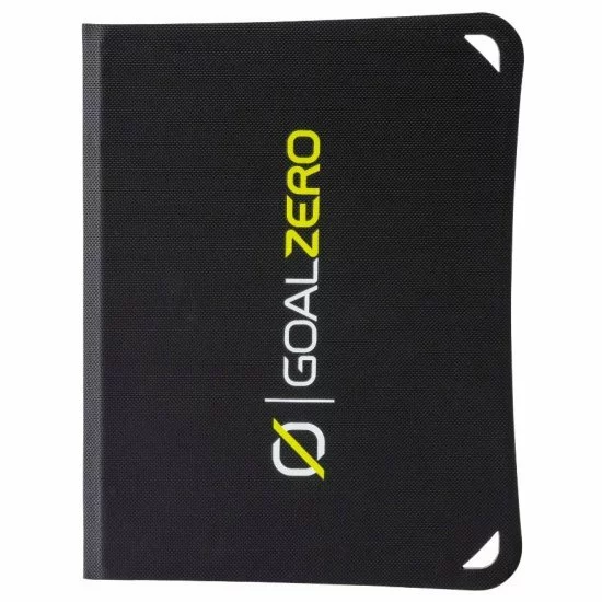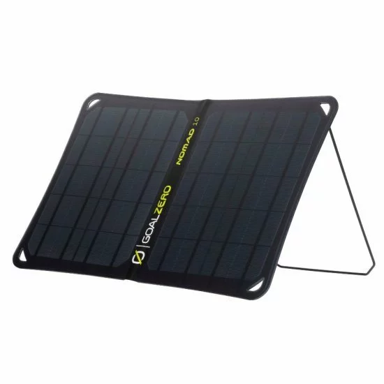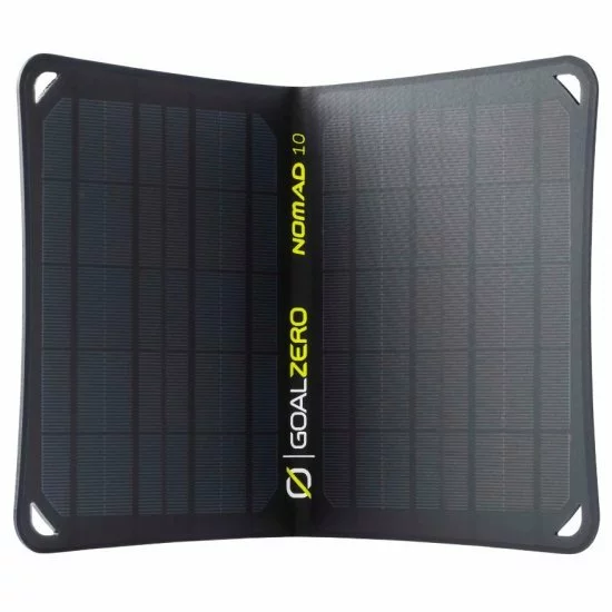 Dise帽ado para una carga solar m谩s fluida, Nomad 10 tiene una base Goal Zero Flip incorporada y un soporte ajustable que se ajusta a presi贸n y se bloquea en su lugar para una mayor estabilidad.