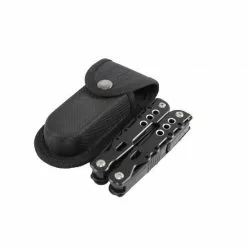 - 14 herramientas: alicates regulares, alicates de punta afilada, cortador de alambre, pelacables, cuchillo pequeño, abrebotellas, abrelatas, cuchillo sin filo, hoja de sierra, lima de uñas, destornillador plano grande, destornillador plano mediano, destornillador plano pequeño y destornillador Phillips