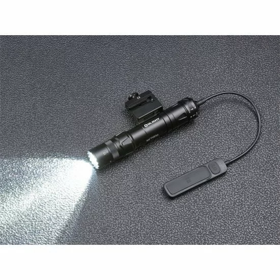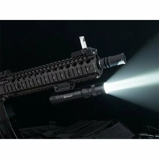 El sistema de montaje de armas incluido se puede conectar de diferentes maneras y el sistema de liberación rápida permite quitar la lámpara del arma de fuego con 1 clic y usarla como linterna. La selección del modo deseado (LED, IR, APAGADO) se realiza con un interruptor de anillo giratorio, este interruptor ergonómico es fácil de operar ya sea que la lámpara se use como lámpara de arma o como linterna.
