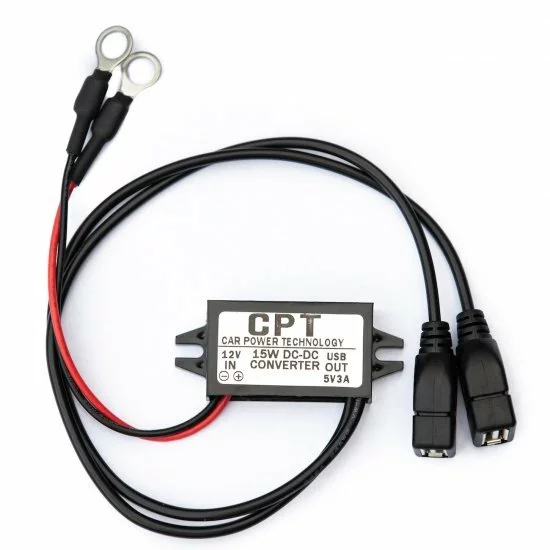 Cable adaptador USB doble para cargar fácilmente un teléfono inteligente o tableta a lo largo del paseo marítimo con una batería de iones de litio Rebelcell de 12V. (¡Nota! Elección de ojos M8 o conectores Faston, según la batería).