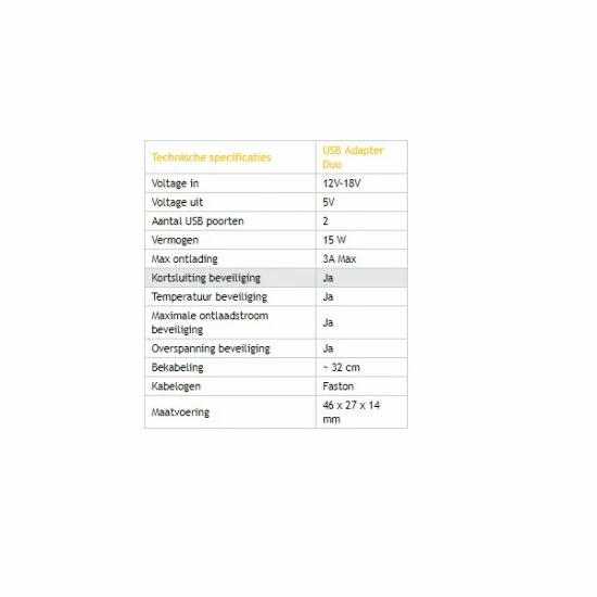 ¡ATENCIÓN!: Utilizar únicamente para cargar dispositivos vía USB (a 5V, max 3A) como GSM y Tablet. Si la batería no se utiliza durante un período de tiempo prolongado, desconecte el cable USB Adapter Duo para evitar que la batería se agote o se rompa.