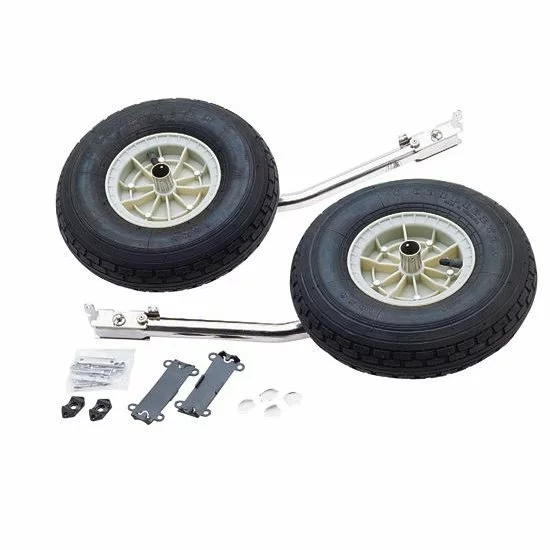 Juego de ruedas de transporte de aluminio ligero con neumáticos, adecuado para botes inflables, botes pequeños de poliéster o aluminio. La altura se puede ajustar fácilmente telescópicamente en 4 alturas diferentes de 57,5 cm a 77,5 cm medidos desde el centro del punto de pivote hasta la parte inferior de la rueda en el suelo. Las ruedas también son muy fáciles de plegar hacia arriba y hacia abajo por medio de un pasador de bloqueo con resorte. El plegado hacia arriba y hacia abajo también se puede hacer en 4 posiciones diferentes (2 arriba, 2 abajo), lo que hace que el conjunto también sea muy adecuado para espejos no exactamente verticales o espejos con partes sobresalientes. Además, toda la pata con rueda se puede quitar fácilmente tirando de un pasador de bisagra asegurado, por lo que no se requieren herramientas.