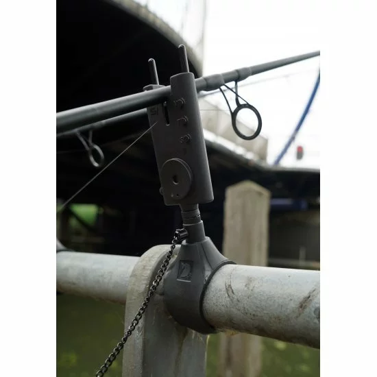 Cuando pesca en puertos, parques o en un entorno urbano, probablemente no le resulte extraño pescar sobre una barandilla. ¡De ahora en adelante al menos puedes dejar el Ducktape en casa! Nuestro exclusivo soporte para barandilla se puede fijar a cualquier barandilla con un diámetro de 50 a 90 mm. Gracias a la rosca de tornillo universal, puede atornillar una sola alarma de mordida o una barra de timbre. El soporte de la barandilla tiene una rosca de 4 mm en la parte delantera para montar un colgador.
