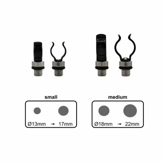 El apoyo para barra de seguridad convence por su diseño especialmente esbelto y elegante. Sostiene la caña con firmeza hasta que el pescador la recoge él mismo. El modelo más pequeño, “Small”, es ideal para cualquier blank estándar, mientras que la versión “Medium” es ideal para empuñaduras full cork y full duplon. Para una sujeción óptima, es importante que el soporte de la barra de seguridad esté perpendicular a la barra. Los brazos flex-grip están hechos de acero para muelles engomado y, por lo tanto, se adaptan perfectamente a la caña.