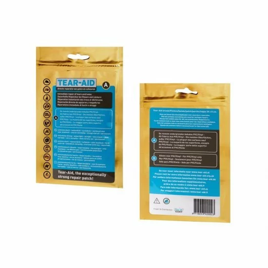 Un producto de reparación multifuncional y transparente. Tear-Aid A repara permanentemente agujeros y rasgaduras en casi todos los materiales. Este producto reparador es extremadamente fuerte, hermético al agua y al aire, muy elástico, no decolora y no se seca. Ideal para la reparación permanente de telas de carpas (de fiesta), velas de poliéster (de tierra), sacos de dormir, colchones de aire de lona, colchonetas autoinflables, llantas de bicicletas, botes, canoas, sombrillas, sombrillas, bidones, trajes de buceo, piscinas, cometas , chaquetas y bolsos. También es adecuado para su uso en productos hechos de aluminio, acero inoxidable, poliéster y más (excepto PVC y vinilo, para los que Tear-Aid B es adecuado). El kit de reparación contiene una tira de cinta de reparación Tear-Aid (30×8 cm), un alambre de refuerzo (45 cm) para reparar grietas en los bordes y cuatro toallitas con alcohol para limpiar la superficie.