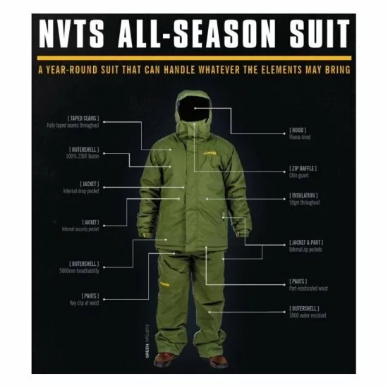 El Navitas All Season Suit 2.0 es la versión mejorada del primer All Season Suit. El objetivo siempre ha sido crear la combinación ideal de calidez, comodidad y estilo, y lo hemos vuelto a conseguir. El traje está totalmente aislado, pero sigue siendo muy ligero. El Navitas All Season Suit 2.0 te brinda protección contra el frío, la lluvia y el viento. El chaleco Navitas Atlas y el chaleco Navitas 1/4 Zip Tech se pueden cerrar con cremallera en esta chaqueta, lo que la hace aún más cálida y cómoda. (no incluido).